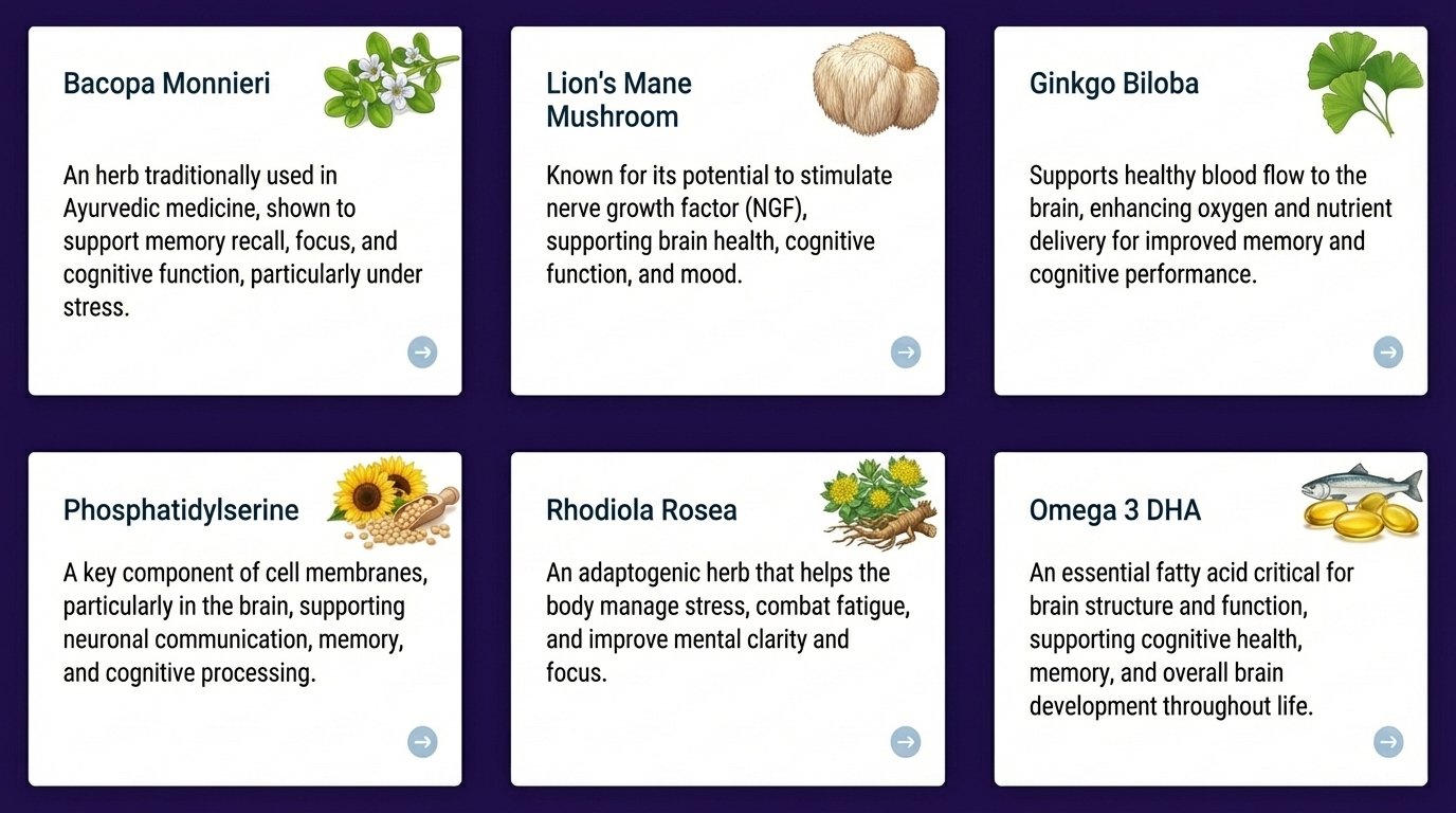 Phosphatidylserine strengthens the structural integrity of brain cell membranes, supporting efficient signal transmission between neurons and preserving cognitive sharpness under stress. Rhodiola Rosea reduces the mental fatigue and cortisol burden that cloud thinking during demanding days, while Omega 3 DHA provides the essential fatty acid foundation that the brain relies on for healthy function, mood regulation, and long term neuroprotection.